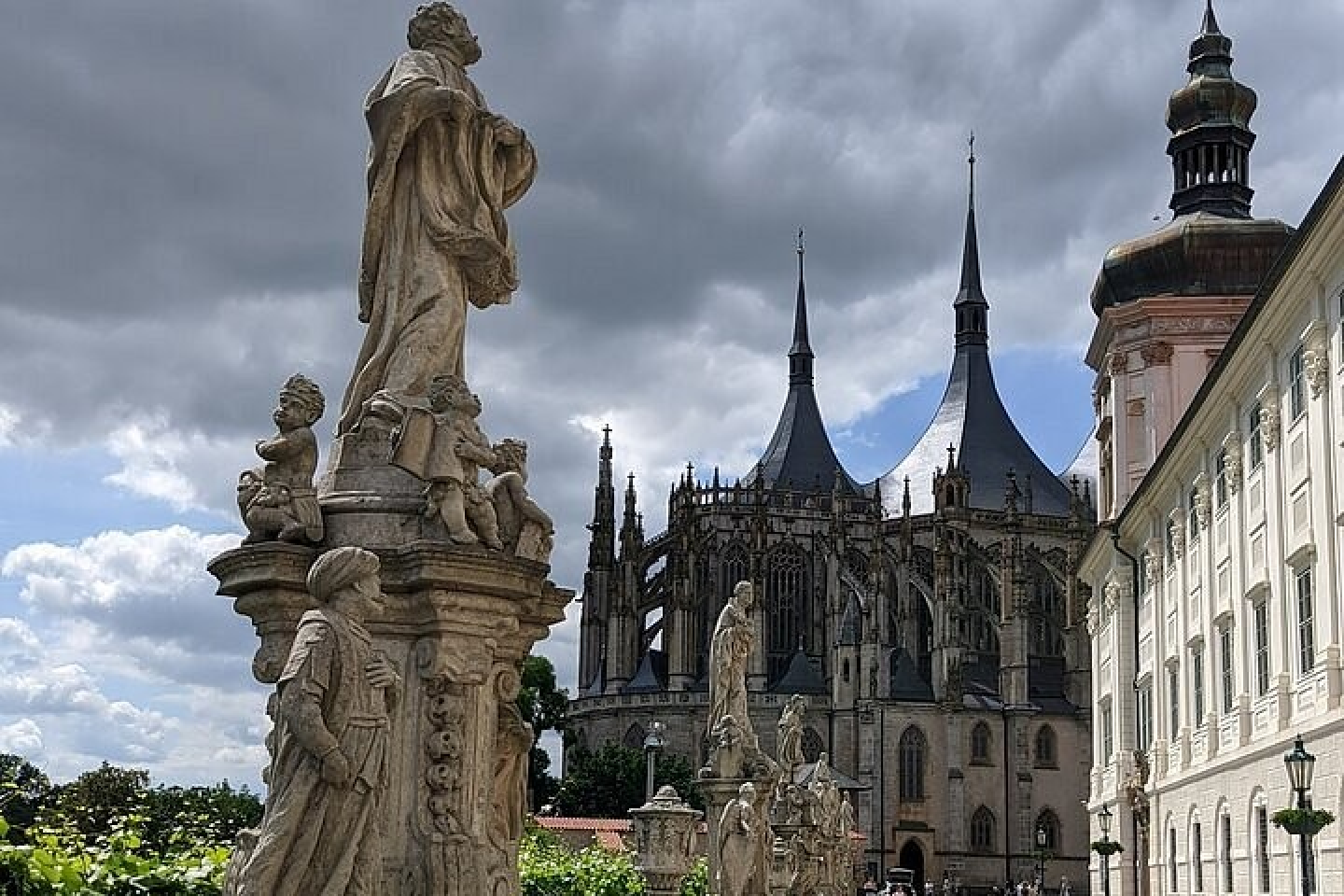 Al final da la exposición de conjuntos escultóricos está la Catedral Gotíca de Santa Bárbara, los interesados visitaremos sus interiores y escucharemos de sus peculiaridades. Esta visita guiada por Kutná Hora continuará por un mirador, la antigua sinagoga y la Fuente de Piedra, monumento civil gótico único. El tour por el casco histórico de Kutná Hora terminará frente a la casa de Piedra, casa civil gótica que más asemeja una iglesia.